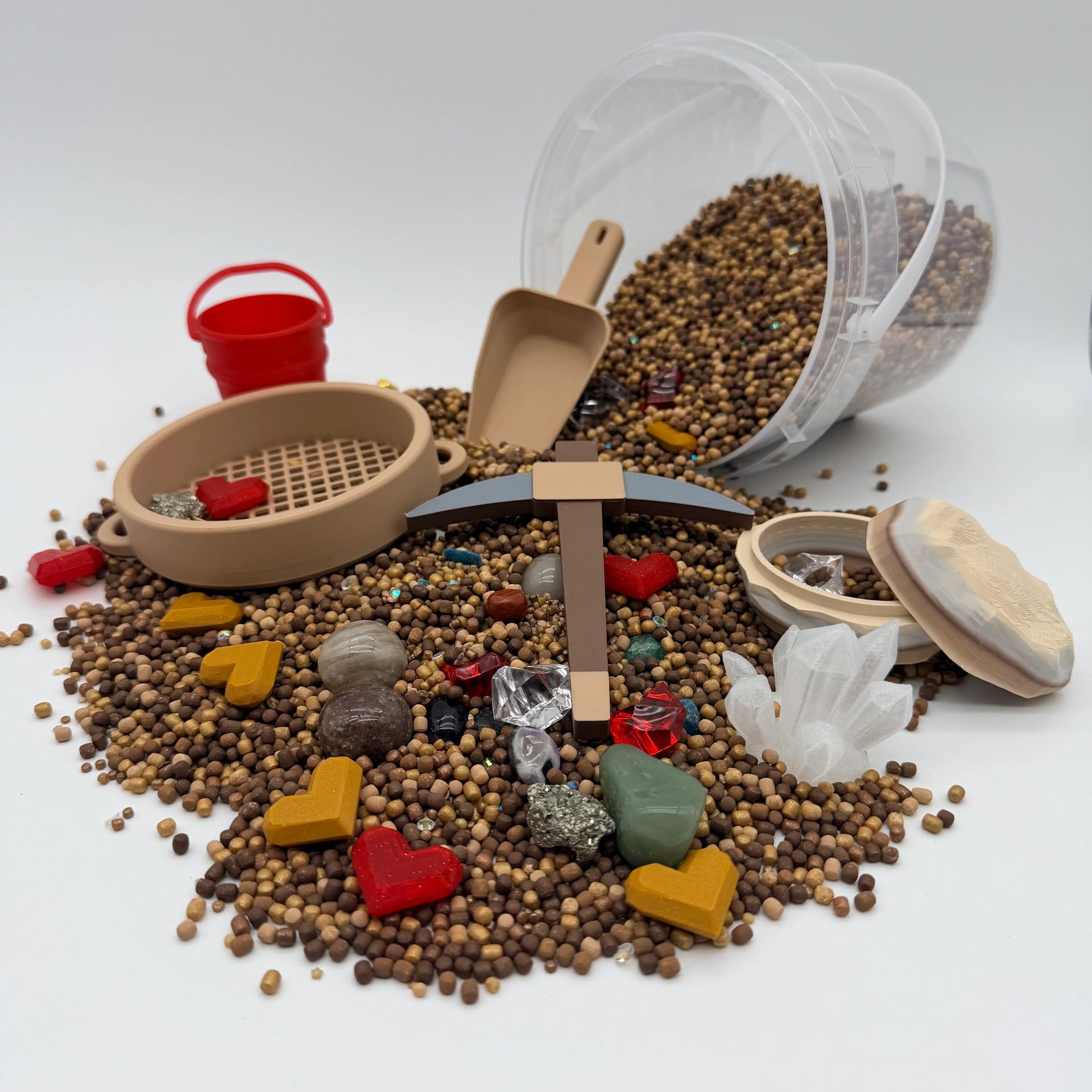 Each bucket is filled with a natural sensory base and hidden treasures waiting to be discovered, just like a real gem dig! Children can scoop, sift, pour, and mine using the included tools while strengthening fine motor skills and imaginative play.